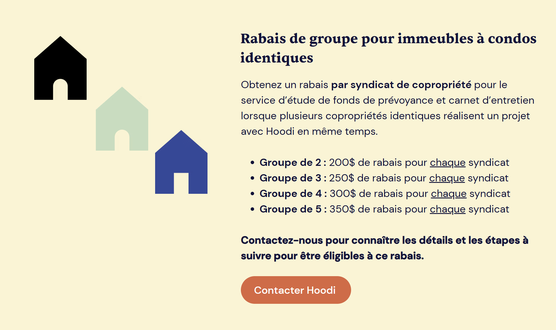 Le rabais de groupe vous permet de bénéficier d’une réduction intéressante sur votre facture. Pour en profiter, vous et vos voisins devez avoir des caractéristiques identiques (immeubles à peu de chose comparables). Ce rabais inclut un réduction appliquée directement à votre facture, une fois le groupe validé.